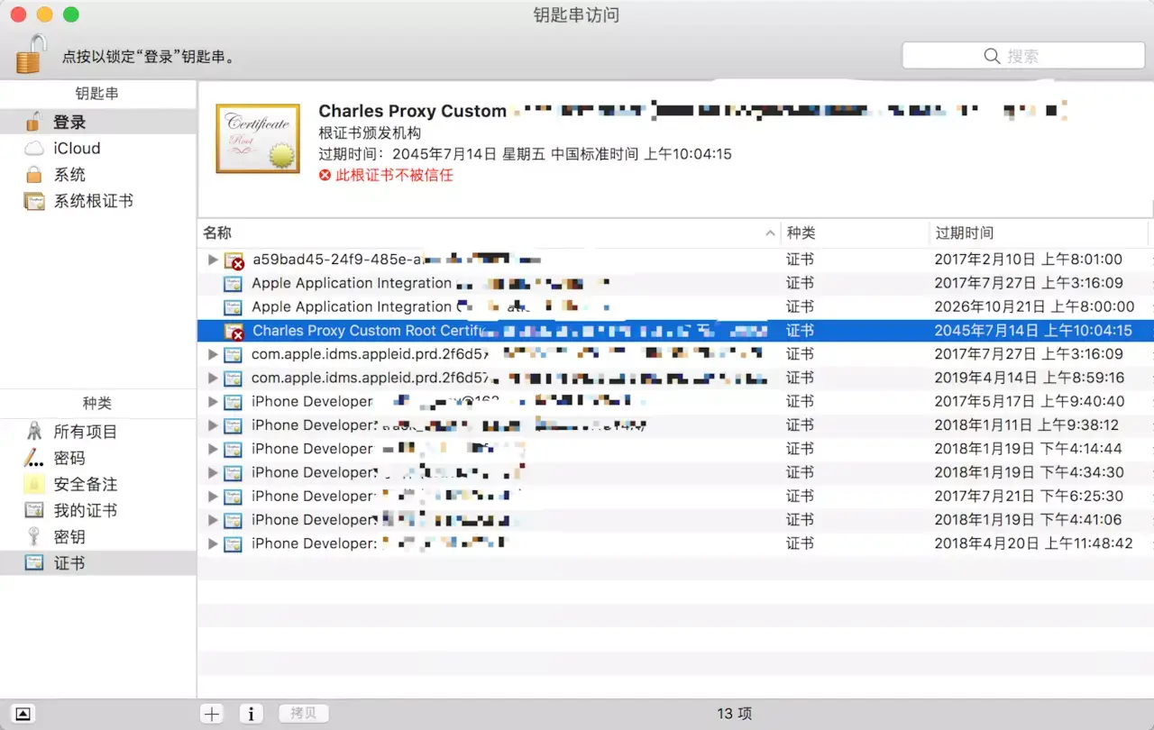 首先,iOS 设备需要验证你的开发者身份,这是基于 macOS 的一种证书策略,如果打开钥匙串访问,选中证书,我们可以看到这样的一堆东西: