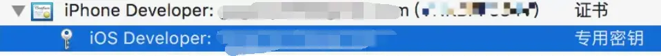 当在 Xcode 添加自己的账号后,并在项目中将 Team 选择为自己的开发者账号后,钥匙串中就多出了这么一个东西: