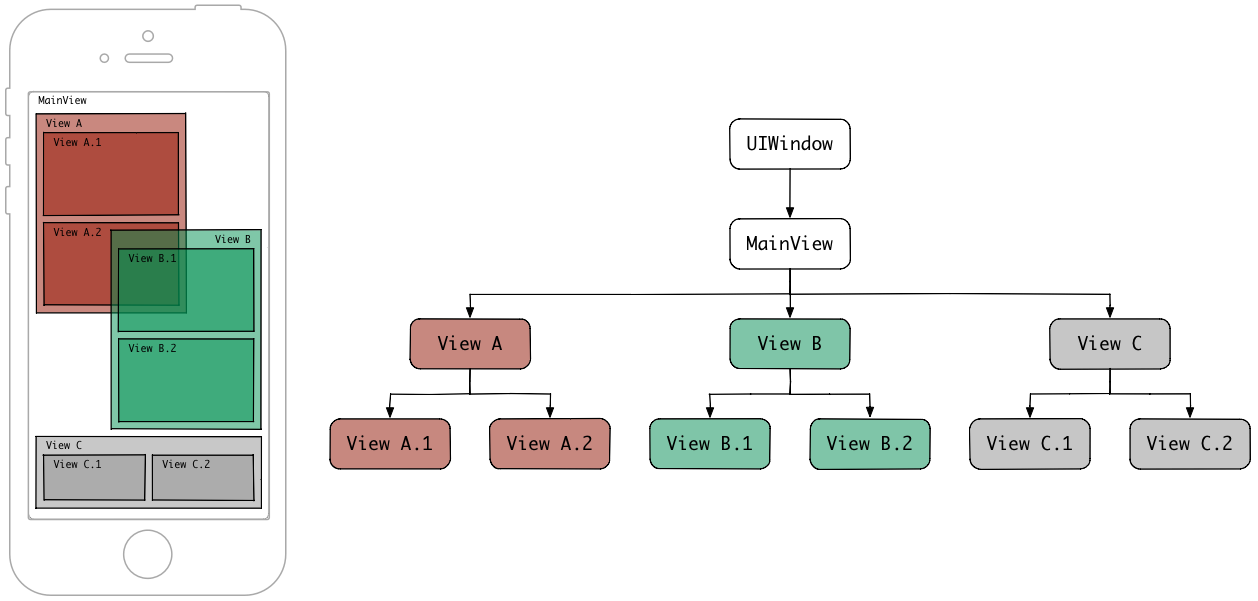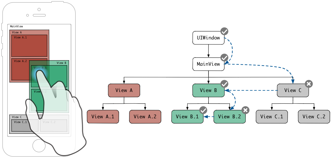 递归是向界面的根节点UIWindow发送hitTest:withEvent:消息开始的,从这个消息返回的是一个UIView,也就是手指当前位置最前面的那个 hittest view。 当向UIWindow发送hitTest:withEvent:消息时,hitTest:withEvent:里面所做的事,就是判断当前的点击位置是否在window里面,如果在则遍历window的subview然后依次对subview发送hitTest:withEvent:消息(注意这里给subview发送消息是根据当前subview的index顺序,index越大就越先被访问)。如果当前的point没有在view上面,那么这个view的subview也就不会被遍历了。当事件遍历到了view B.1,发现point在view B.1里面,并且view B.1没有subview,那么他就是我们要找的hittest view了,找到之后就会一路返回直到根节点,而view B之后的view A也不会被遍历了。