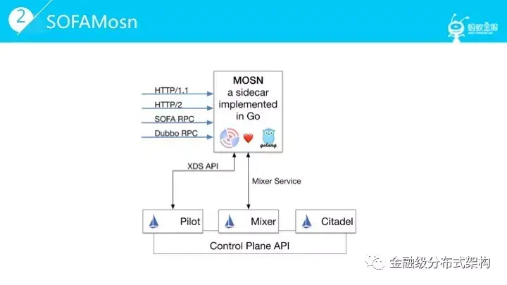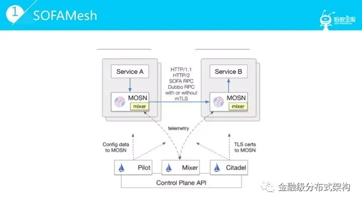 大家看到的图示是基于 Istio 的架构,在数据平面我们使用 SOFAMosn 替代了 Envoy,同时加入了一些蚂蚁实践中摸索的改进。