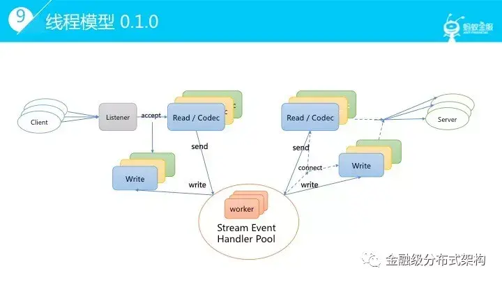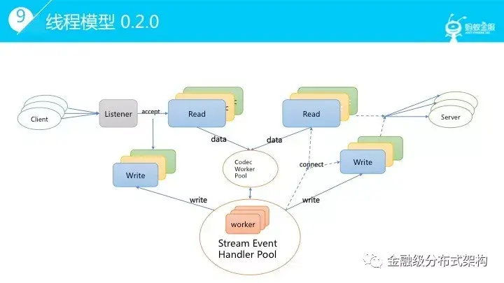 了解了分层设计和转发流程,我们再看下线程模型。从 0.1.0 版本的线程模型,可以看到每个链接的 IO 协程是成对出现的,读协程负责读取,事件机制及 Codec 逻辑,数据上升到 steam 层,具体的 stream 事件由独立的常驻 worker 协程池负责处理。