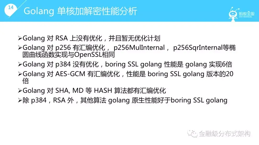 此外,前面提到过 TLS 的实现,我们再来看一下性能方面的一些探索。首先介绍了一下测试的场景。在这个场景下,我们发现对于 ECDHE 算法,Golang 原生的实现性能虽然低于Ningx(使用 OpenSSL),但是高于 Golang with boring SSL。通过对具体算法和协议的性能压测,代码调研我们得出如下结论。可以看出对于 ECDHE-P256加密套件,Golang 原生实现的性能是很不错的,可以放心使用。