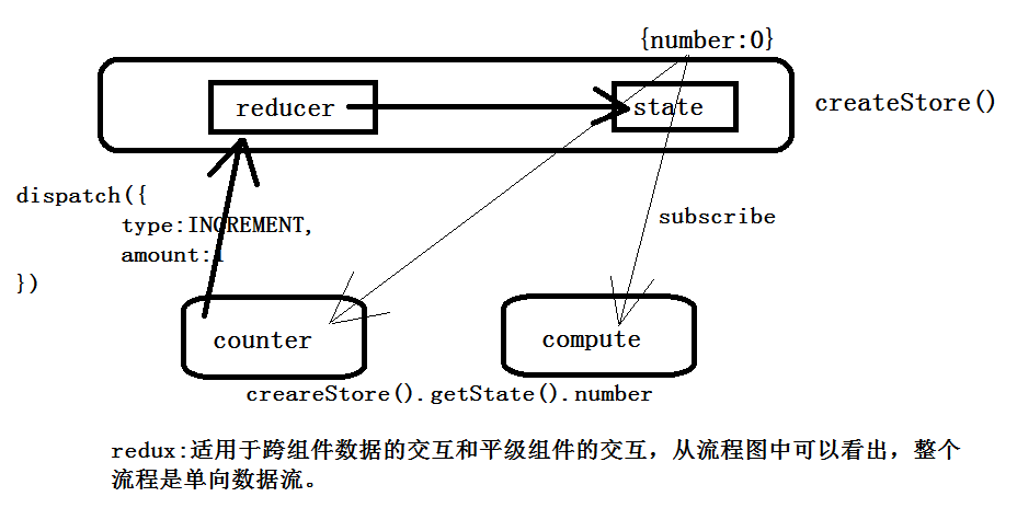 所有组件不能直接去更改状态,只能通过dispatch告知给管理器reducer去更改状态,reducer也是用户定义好传递给createStore。dispatch必须有个type属性,管理器reducer通过这个属性值判断并且更改状态,