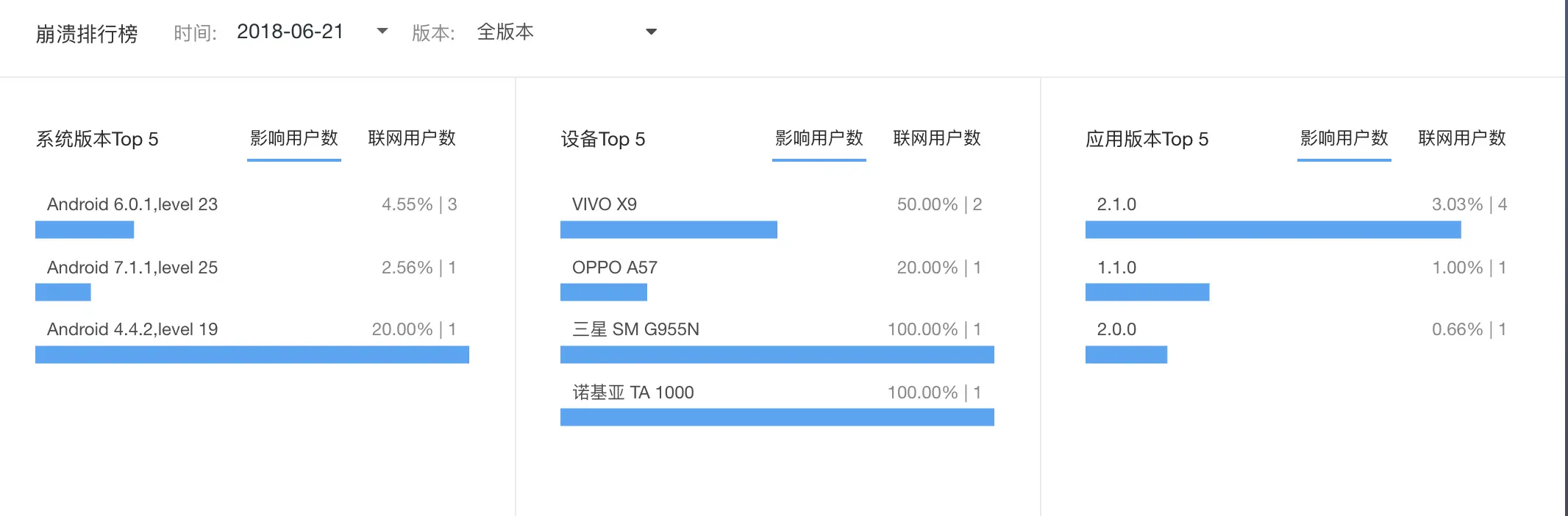- Bugly 平台也可以针对版本,机型,系统,来对比异常数据的变化。