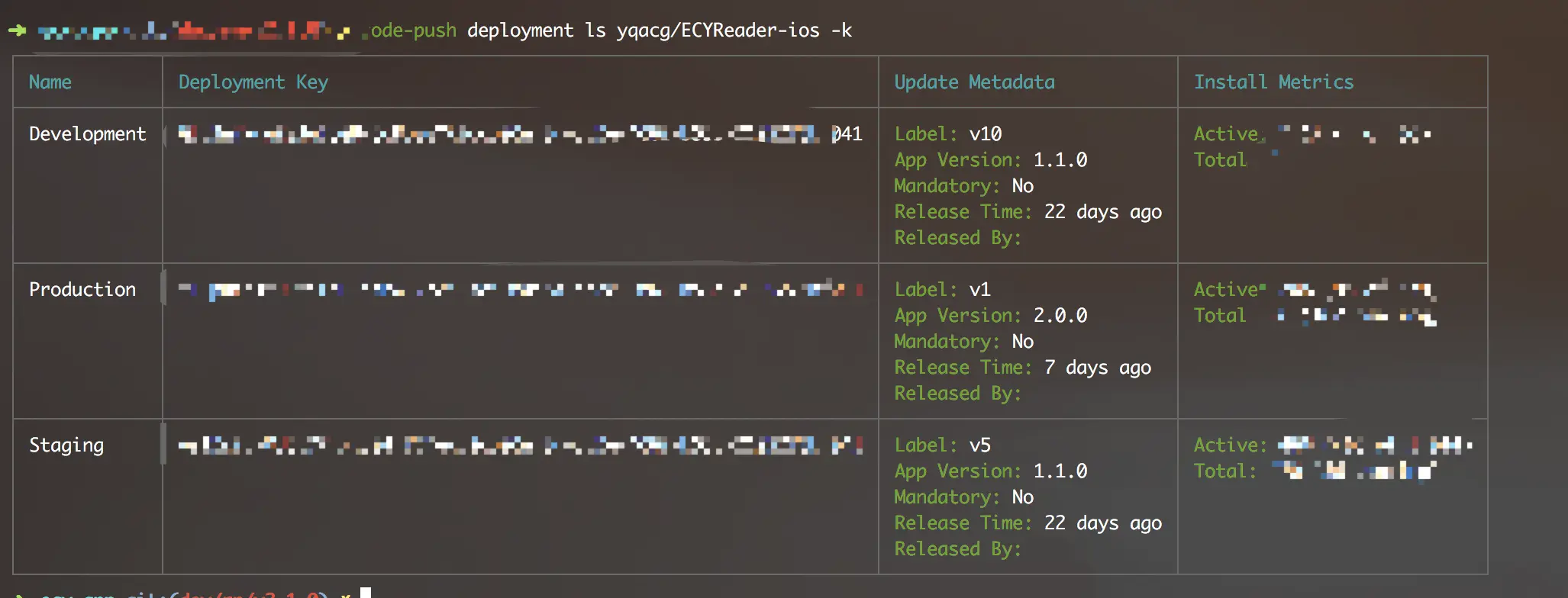 在注册 app 的时候,会返回一套 deployment key,分别为 Production 和 Staging 环境(后续也可以自定义 deployment key 名称),在集成 CodePush SDK 的时候会用到。Production 对应生产环境的 key,Staging 对应测试环境的 key。这样就可以分别更新不同环境的包。如果想要查看 app 的 deployment key 表,可以使用下面的命令: