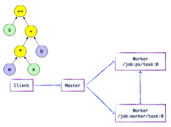 TensorFlow有一个重要组件client,顾名思义,就是客户端,它通过Session的接口与master及多个worker相连。其中每一个worker可以与多个硬件设备(device)相连,比如CPU或GPU,并负责管理这些硬件。而master则负责指导所有worker按流程执行计算图。TensorFlow有单机模式和分布式模式两种实现,其中单机指client、master、worker全部在一台机器上的同一个进程中;分布式的版本允许client、master、worker在不同机器的不同进程中,同时由集群调度系统统一管理各项任务。