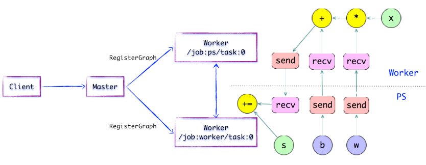 如上图所示,如果计算图的边被任务节点分割,Distributed Master将负责将该边进行分裂,在两个分布式任务之间插入SEND和RECV节点,实现数据的传递。