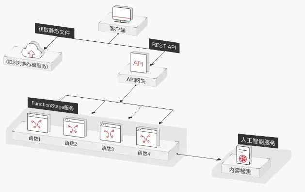 创建函数,在函数中调用华为云内容检测服务提供的文本检测接口,实现文本的敏感词检测,并为该函数配置一个APIG触发器,对外提供敏感词过滤的API,从而构建出一个完整的敏感词过滤的无服务器系统。客户端调用API,他会自动触发函数执行,而开发者编写的函数只需实现接收到文本之后如何处理文本的逻辑(调用内容检测服务服务)即可,最后将结果返回给客户端。至此,我们就构建了一个完整的无服务器敏感词过滤系统。