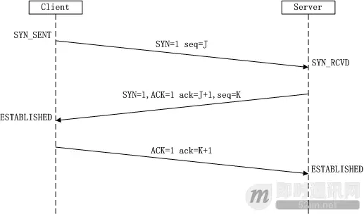 (2)第二次握手: Server收到数据包后由标志位SYN=1知道Client请求建立连接,Server将标志位SYN和ACK都置为1,ack=J+1,随机产生一个值seq=K,并将该数据包发送给Client以确认连接请求,Server进入SYN_RCVD状态。