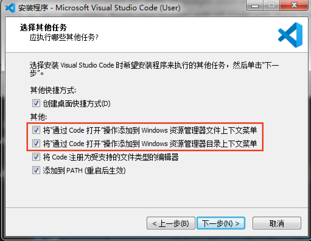 在安装时推荐勾选如图两个选项,这样右键文件夹或文件就可以直接使用 VS Code 打开了,非常方便。