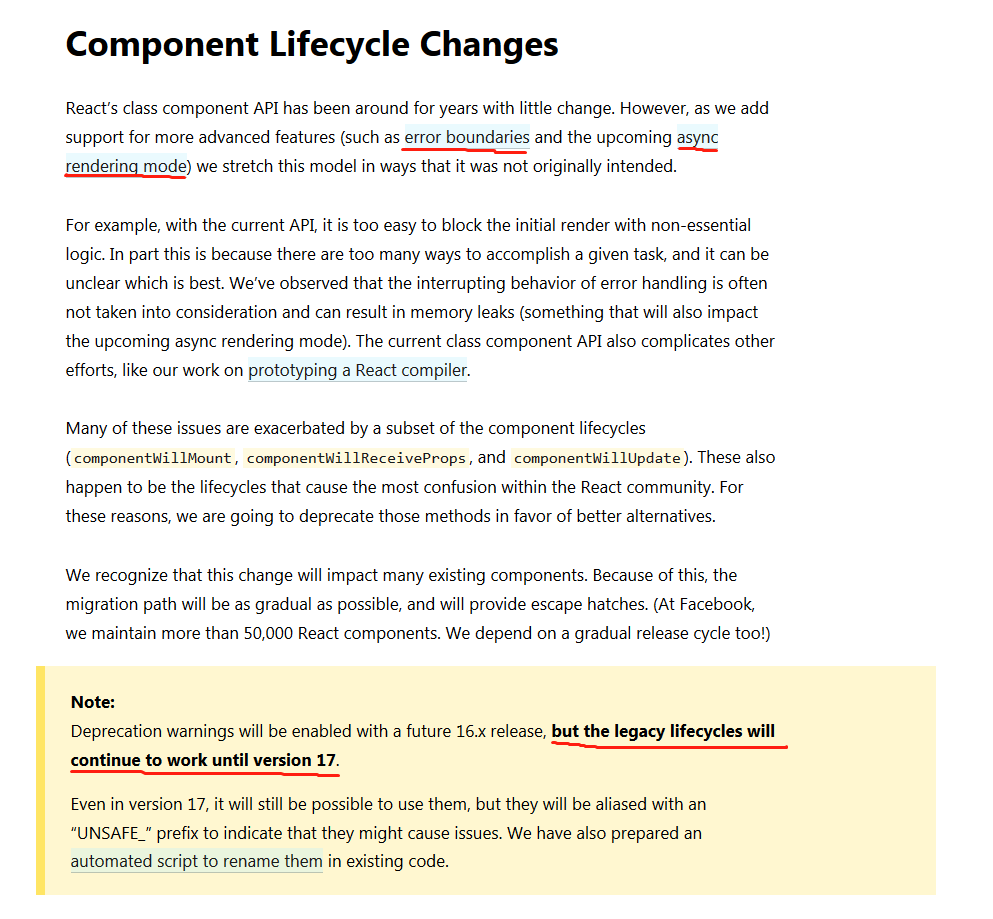 - 在React17引入async render之后,render阶段和commit阶段可能并不是同步连贯的,因此,componentDidUpdate和componentWillUpdate获取到的Dom可能是不同的,这样就会导致读取到的dom元素的状态是不安全的。