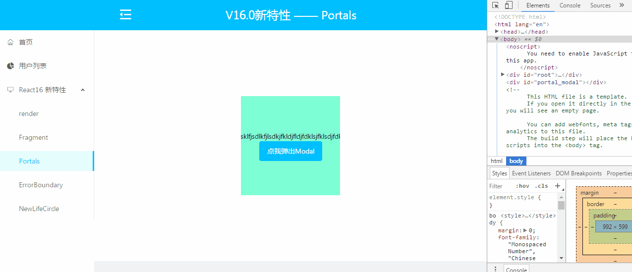 从上图可以看出来,弹窗的父组件应该是挂载在#app这个dom下面的,通过portals,我们将modal框挂载在#portal_modal这个dom下了。虽然最后的modal组件没有挂载在整个应用所在的#app下,但是portals创建的组件里面的事件依然会冒泡给它自身的父组件,父组件可以捕获到被挂载在#portal_modal节点下面的modal的点击事件。