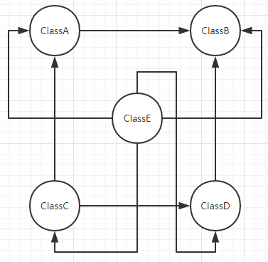 在没有IOC之前,类与类之间的耦合关系是这样的。这儿仅仅只有5个类,类之间的耦合关系就如此复杂,难以想象当类的数量随着业务发展而爆炸增多的时候,耦合关系是多么的糟糕。
