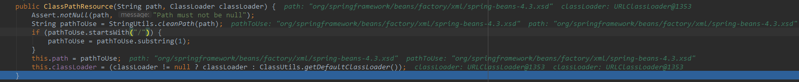 }再看看loadBeanDefinitions()方法 ,这里解释下什么是BeanDefinition (所有的Bean在Spring容器中的数据结构都是BeanDefinition,其中包含了跟这个bean相关的所有信息)beanDefinitionReader可以看做是一个IOC容器bean的生产者,可以从外部环境(xml,注解等)获取到bean的信息并装载进去,这个方法对beanDefinitionReader 设置了ResourceLoader,EnitityResolver等等对解析xml文件很重要的类,继续Debug看。