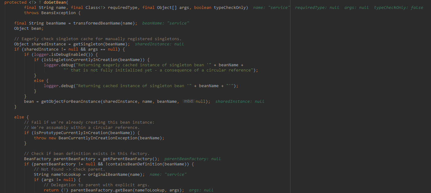 这儿走了一遍getBean的逻辑,不过因为没有初始化,去到的实例都是null,接着会标记即将创建的bean,并将其缓存