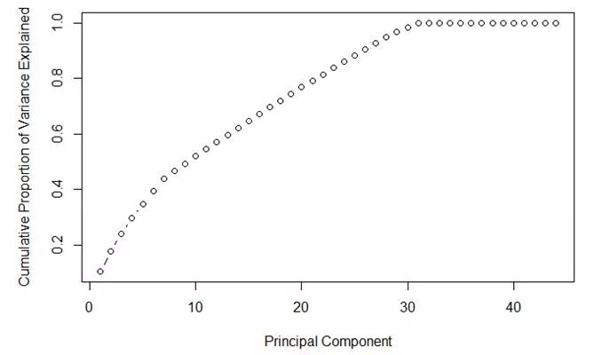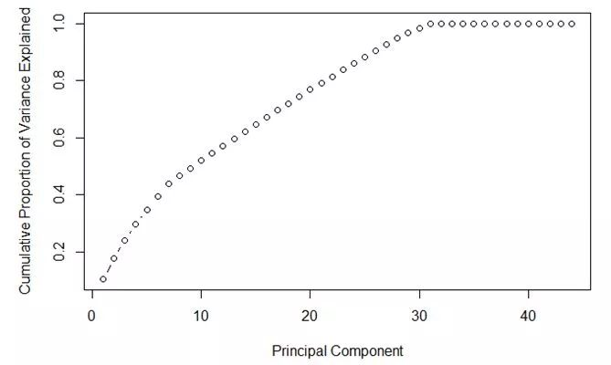 显然,当主成分数目为 30 的时候,积累的方差比例最大。