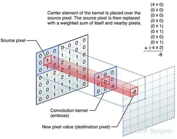 中间滤波器filter与数据窗口做内积,其具体计算过程则是:4*0 + 0*0 + 0*0 + 0*0 + 0*1 + 0*1 + 0*0 + 0*1 + -4*2 = -8