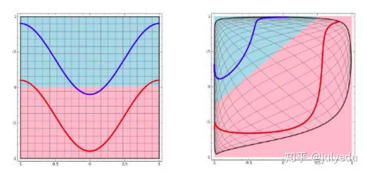 下图可以很形象的解释这个问题,左图用一根线是无法划分的。经过一系列变换后,就变成线性可解的问题了。