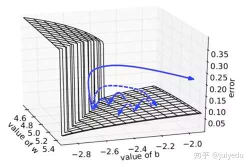 下图可视化了梯度截断的效果。它展示了一个小的rnn(其中W为权值矩阵,b为bias项)的决策面。这个模型是一个一小段时间的rnn单元组成;实心箭头表明每步梯度下降的训练过程。当梯度下降过程中,模型的目标函数取得了较高的误差时,梯度将被送到远离决策面的位置。截断模型产生了一个虚线,它将误差梯度拉回到离原始梯度接近的位置。
