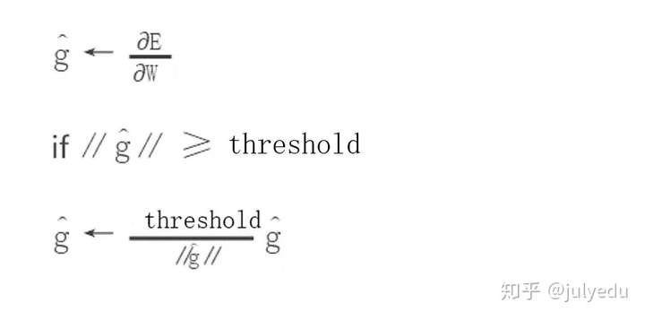 为了解决梯度爆炸问题,Thomas Mikolov首先提出了一个简单的启发性的解决方案,就是当梯度大于一定阈值的的时候,将它截断为一个较小的数。具体如算法1所述: