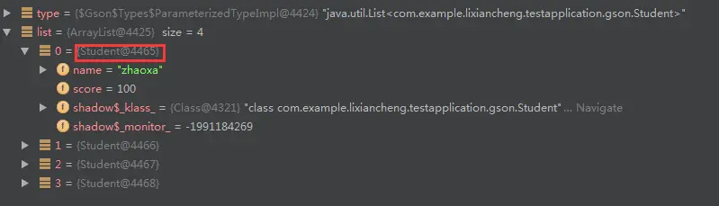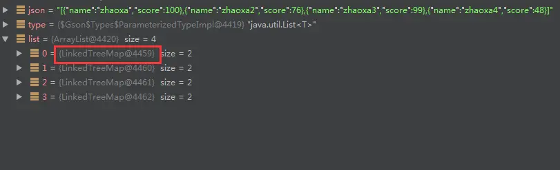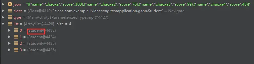 可以看到,list中的数据类型不是Student,而是LinkedTreeMap,LinkedTreeMap是Gson库内部数据模型,换句话说我们的解析失败了,尝试着将parseString2List方法中的泛型T去掉,运行结果一样,说明Gson解析时不支持泛型。