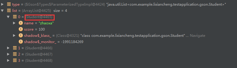 可以看到,list中的数据类型不是Student,而是LinkedTreeMap,LinkedTreeMap是Gson库内部数据模型,换句话说我们的解析失败了,尝试着将parseString2List方法中的泛型T去掉,运行结果一样,说明Gson解析时不支持泛型。