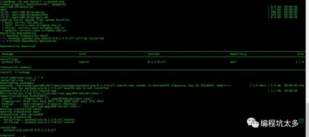 默认python2.7在centos都安装了,就用python来演示,演示之前需要安装pip工具,类似java的maven管理python模块的工具
