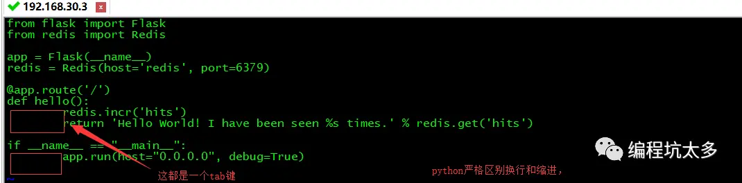 2) 编辑app.py并保存(描述:简单的一个httpserver,主要是为了类似tomcat的一个sevlet,当访问一次,redis节点就增加一个,就可以看到相应的输出)