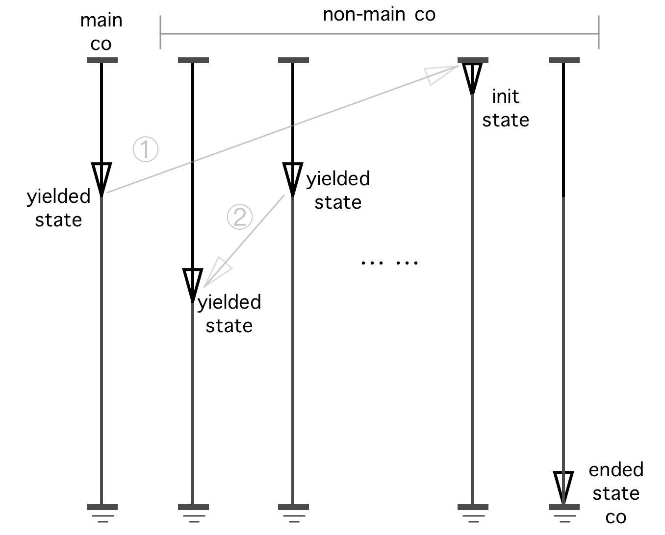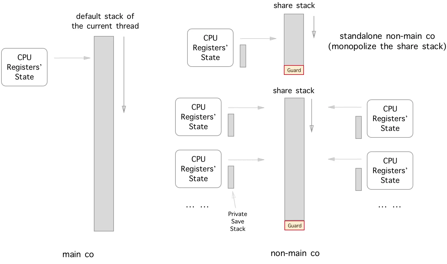 用户在创建新的协程时,可以选择其拥有一个独占的执行栈,或者是与其它任意数量的协程一起共享一个执行栈;