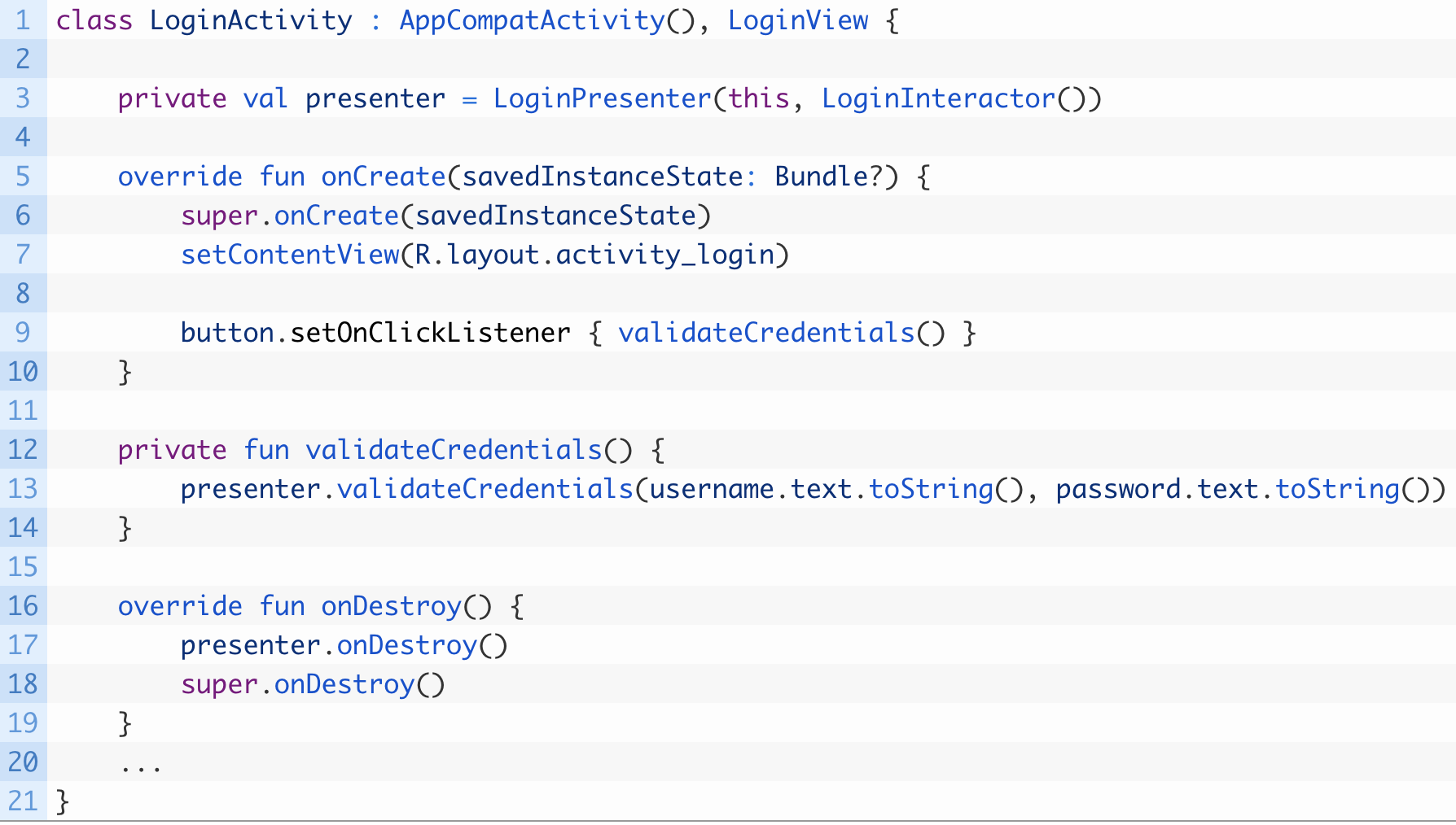 Separating interface from logic in Android is not easy,but the MVP pattern makes it easier to prevent our activities end up degrading into very coupled classes consisting of thundreds or even thouds of lines.