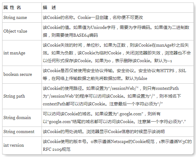 1) name: cookie 的名称 2) value: cookie 的 值 3) maxAge: cookie 的 最大有效期 4) secure: 是否使用安全协议传输 5) path: cookie 使用的 路径。 不同路径无法获取到。 6) domain: cookie 的域, 和 path 类似。主要防止跨域攻击。 7) comment: 该cookie 的用处说明 8) version:cookie 的版本