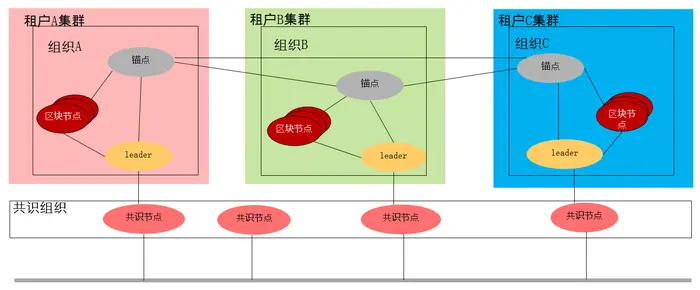 在华为云区块链服务中区块链联盟成员独立为单独的一个租户,每个租户单独运行在一个VPC中,利用华为云VPC数据隔离机制来保障每个联盟成员的数据隔离和权限隔离,从而满足区块链系统的多中心化、多方参与、多方共识和不可篡改等独立、安全原则。例如在如下的三个租户建立的联盟链网络中,每个租户在自身的VPC内构件区块链的组织和节点,用于存放账本数据。只有租户的管理者才会对自己本VPC内的节点和数据具有管理权限。每个租户可以设置EIP(externalIP)和端口,将锚点的访问地址发布以便其他租户集群的锚点可以与其建立连接。同样,我们将共识组织内的节点构建于一个私有集群,并为每个共识节点发布EIP和端口,使得各租户组织的leader节点可以与共识节点建立连接。