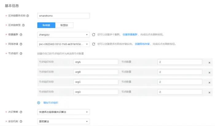 在区块链服务订购页面,如下图所示安全机制选项选择国密算法,点击确认后就可以创建一个使用国密算法签名成员身份证书的区块链网络。