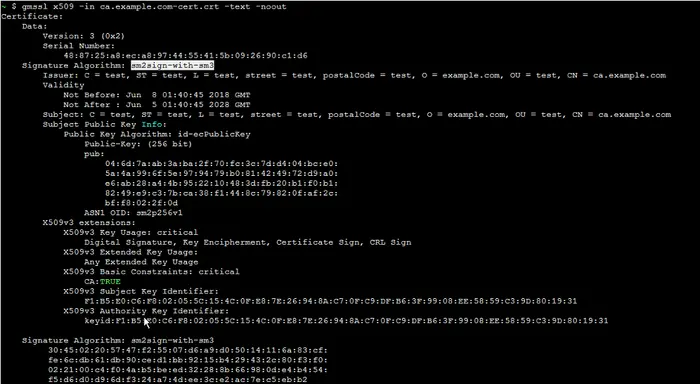 开发者可使用openssl命令opensslx509 –in ca.example.com-cert.crt –text -noout查看所下载的证书内容是否采用国密签名机制如下图所示。