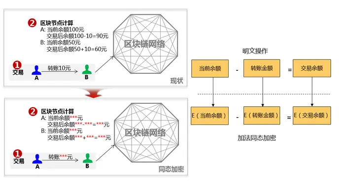 如上图中A向B转账10元,需要区块链节点记账,但是用户不想让区块链节点知道交易金额以及最新余额。同态加密技术可以实现无密钥方对密文的计算,密文计算无须经过密钥方,既可以减少通信代价,又可以转移计算任务,平衡各方的计算代价。华为BCS服务首先提供同态加密库,对用户的交易数据用其公钥进行加密保护,交易的时候都是密文运算,最终账本中加密保存,即使节点被攻破,获取到账本记录也无法解密;其次华为BCS服务提供范围证明校验,背书节点能够对密文进行背书,无需解密就能校验交易的正确性,如校验转账金额是否为负数,从而识别出恶意交易风险,保证了智能合约的正确执行。