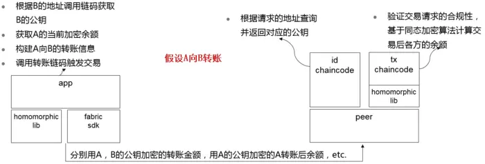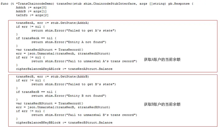 基于如上公钥地址的设置,当A向B转账时,在上层应用app端主要包含四个步骤,即1)根据转账接收方B的地址调用idchaincode查询B的公钥值;2)从账本数据中获取发起方A的当前加密余额;3)构建A向B的转账信息;4)调用转账链代码txchaincode触发交易,代码示例如下。其中pswapi_sdk.PrepareTxInfo是同态加密库homomorphiclib提供的方法,六个参数分别为发起方的当前金额密文cipherBalanceAKeyA,转账金额transNum,A的公钥PubKeyA,B的公钥PubKeyB,A的私钥PriKeyA和A的私钥保护口令propwd。经过该方法构造的转账信息txInfoSer中含有分别用A和B的公钥加密的转账金额,用A的公钥加密的A转账后的余额等。该txInfoSer数据被序列化后在TLS通道中传递给链代码方,触发链代码的转账运算。
