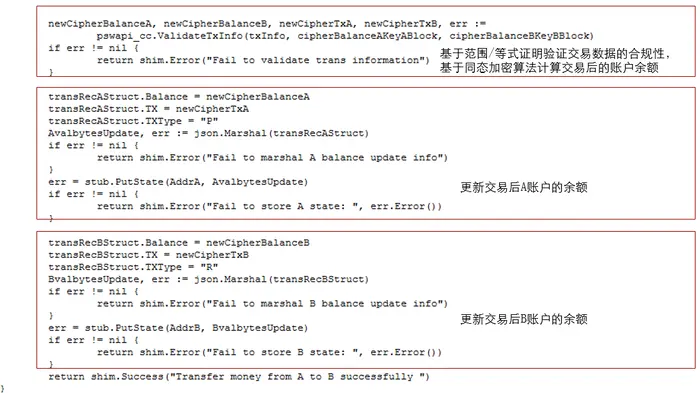 对应的在链代码这一端,需要执行的逻辑包括1)获取A/B账户当前的余额;2)基于范围/等式证明验证交易的合规性,并基于同态加密库计算交易后的账户余额;3)更新交易后的A/B账户的余额,代码示例如下。其中pswapi_cc.ValidateTxInfo是同态加密库homomorphiclib提供的方法,三个参数分别为应用端传送过来的转账信息txInfo,发起方A的当前加密余额cipherBalanceAKeyABlock,接收方B的当前加密余额cipherBalanceBKeyBBlock。该函数内部执行基于范围/等式验证(如验证转账金额是不是负值,A转账后的余额是不是负值等)的同态加密运算,并返回运算结果即转账后的A的加密余额newCipherBalanceA和B的加密余额newCipherBalanceB。最后,该链代码将各方转账后的余额密文更新到账本数据中。