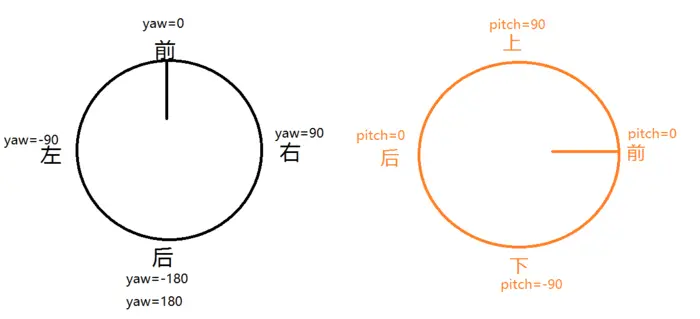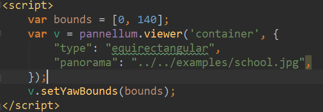 圆圈中的直线代表视角方向,水平方向用yaw值表示,取值为180度到-180度,竖直方向用pitch值表示,取值为90度到-90度,yaw和pitch两个值共同表示整个投影坐标系。在实际使用中可以通过setYaw(),getYaw(),setPitch(),getPitch()等方法将视角移动到指定的坐标处,也可以获取当前视角对应的坐标位置。接下来需要注意的是Pannellum提供了setPitchBounds(number[])方法和setYawBounds(number[])方法,这两个方法的作用是限制视角的移动范围,例如如果想将视角限制在水平yaw值0~140的范围内,设置如下: