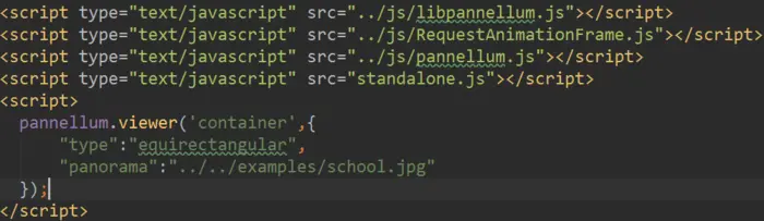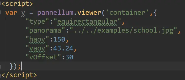 由于Pannellum使用闭包的方式向外提供接口,因此就可以将pannellum作为一个类来操作,viewer(arg1,arg2)作为构造函数来构造全景显示器,arg1就是页面中用于展示全景图的<div>,arg2是一系列参数的集合,定义了全景的各项显示参数,上图定义了在id为‘container’的<div>中显示school全景图,全景图投影类型为圆柱体投影(equirectangular)。