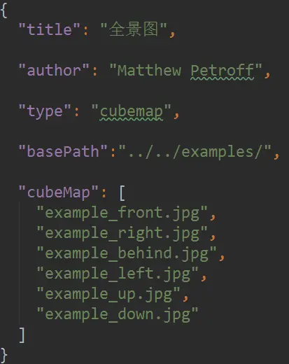 立方体投影是针对拆分全景图片的投影方式,即将整个投影空间看作一个立方体,具有前后左右上下6个面,分别将各个拆分全景图片渲染在对应的各个面上,在感官上也能够达到柱面投影的效果。在使用cubic投影方式处理全景图片的时候需要配置json文件,在json中配置图片路径、标题、作者、标注点等信息,首先根据上文的拆分后的全景图配置json文件: