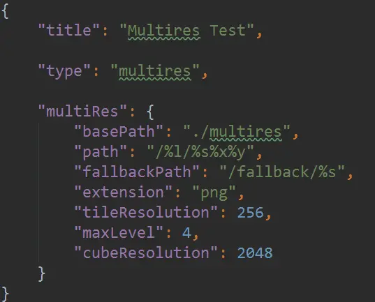 构建multi-resolution的全景图片方式和cubic方式相同,不同的是type为multires,并且需要改变json配置文件: