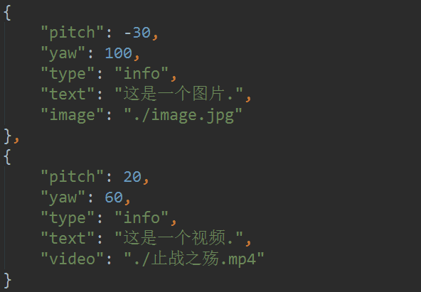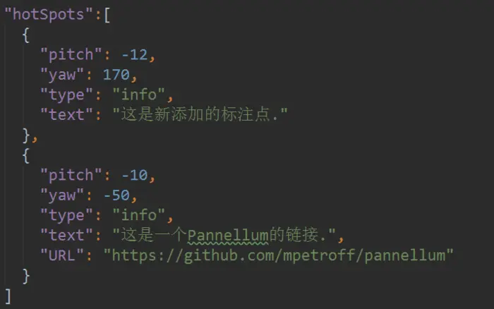 标注信息的属性很简单,yaw和pitch分别表示标注点的坐标,type只有两种类型:info和scene,info类型的是直接在全景图上展示的标注,scene类型标明这个标注点指向另一个全景图,也可以说是另一个“场景”,后面要介绍的全景漫游就是使用的scene类型的标注。text里是该标注的提示文字,如果该标注是个可以点击的链接的话,还需要在后面添加上URL,指向链接的地址。