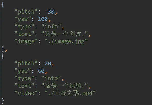 在Pannellum中要实现场景的转换同样只需要修改json配置文件: