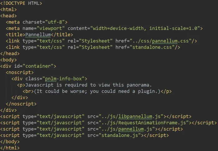 首先需要一个展示全景图片的html页面pannellum.htm,引入pannellum相关的js文件和css文件: