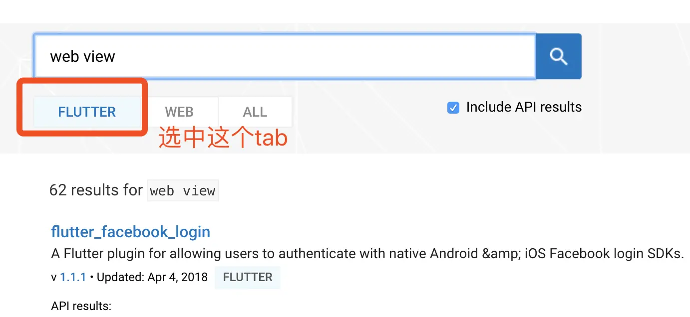 由于我们是开发Flutter应用,所以要在搜索结果中过滤出供Flutter使用的插件,如下图所示: