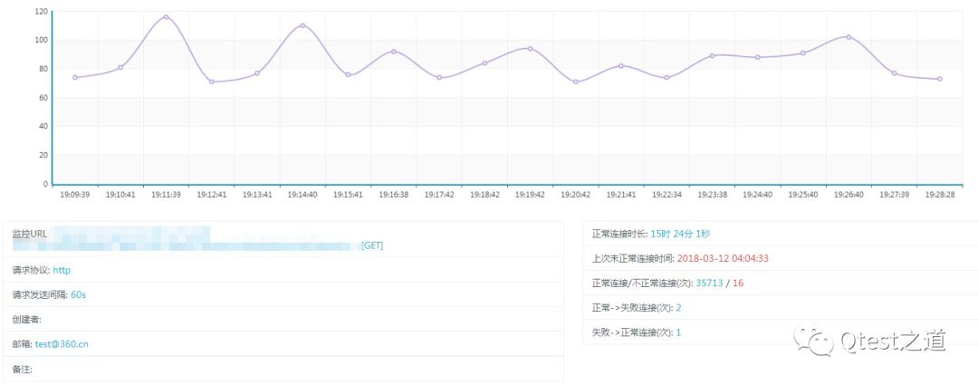 我们首先做的,就是依托现有的三剑客Ialert监控系统(http://www.jiekouceshi.com/ialert/),将所有服务器都做了单独的接口级监控,并设置了合理的业务逻辑断言,一旦接口经过断言不满足超过3次,则触发短信报警。接口本身的监控能够确保我们随时获知自身的每台服务器的异常情况。下图为Ialert系统中对于某接口的监控概览。