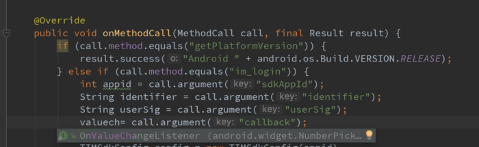 }然后,我们看看MethodChannel.MethodCallHandler的实现实例那边解析参数的方式