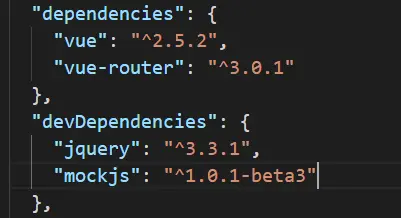 在工程文件夹下运行以下命令 npm install --save-dev mockjs 由于我只需要在开发环境中使用mockjs,所以参数加上-dev,这样在package.json文件中,只有devDependencies包含mockjs的依赖。