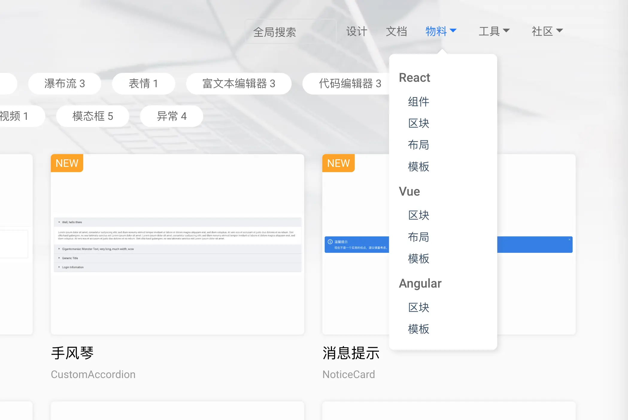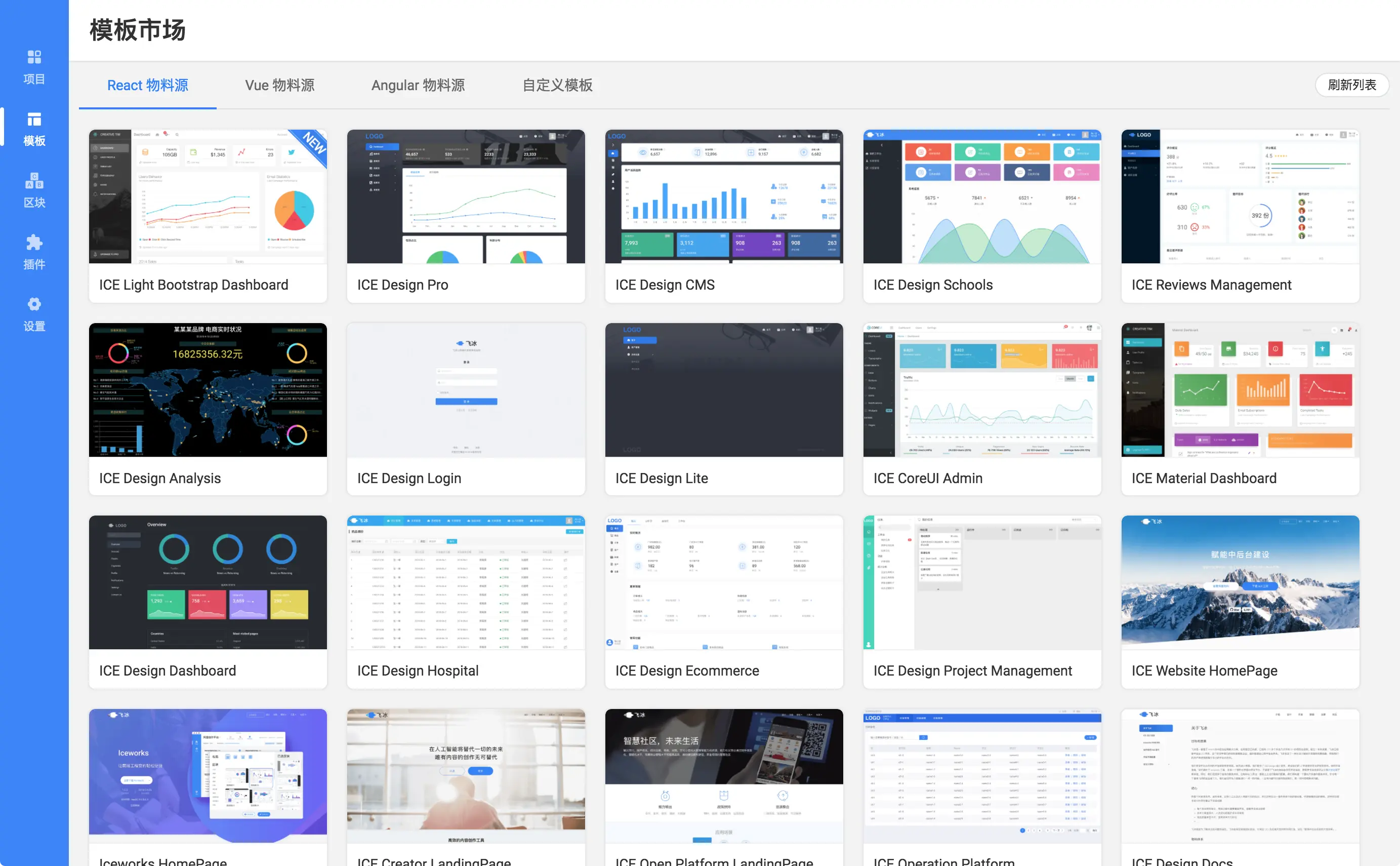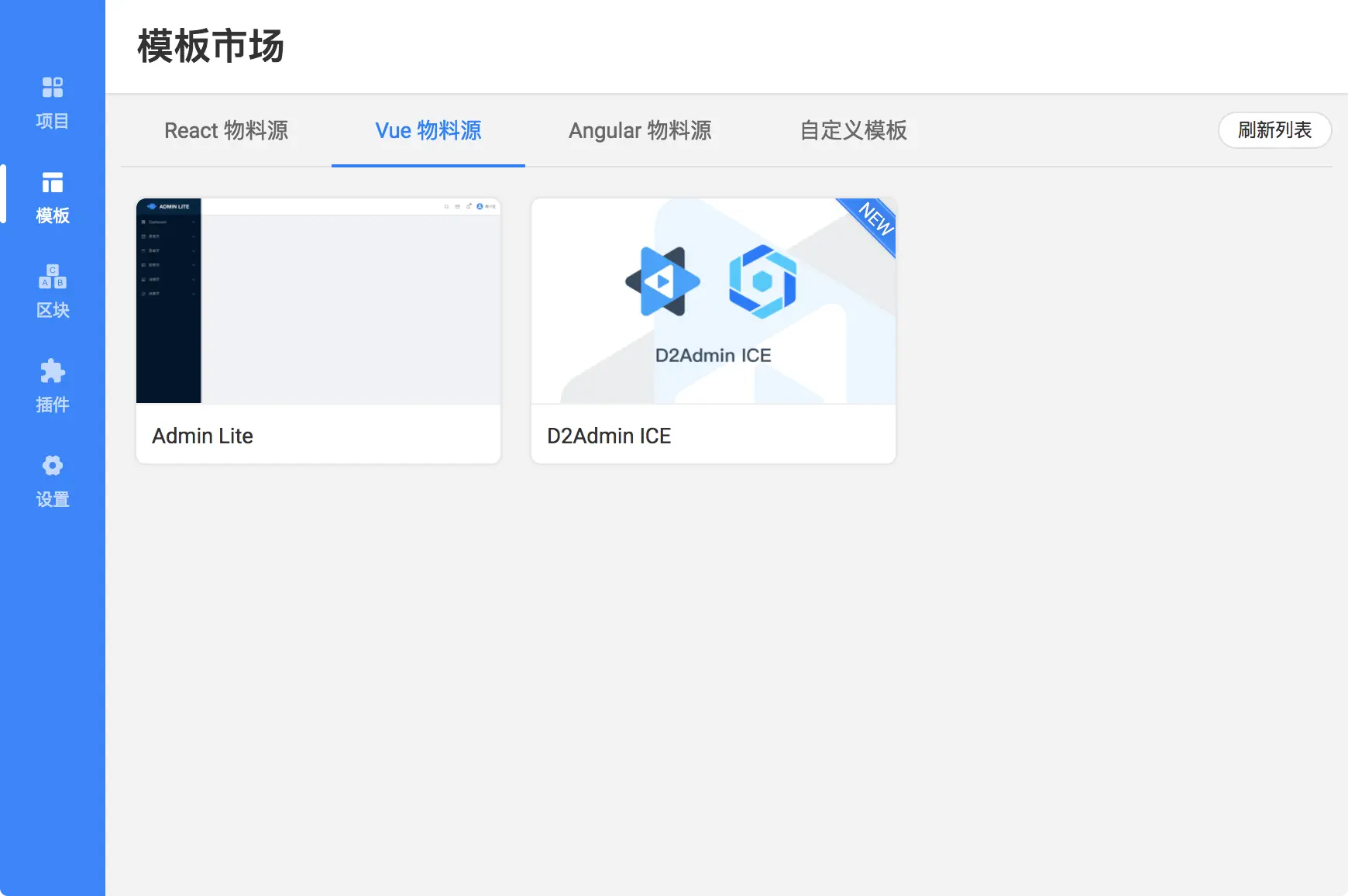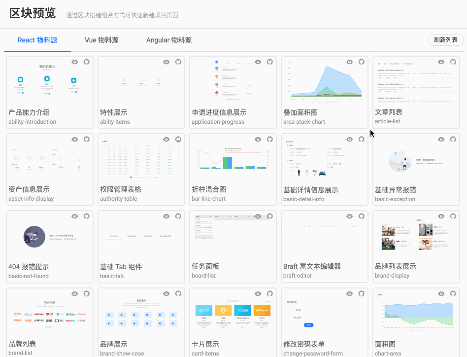 飞冰是从 react 开始做的,现在 vue 和 Angular 物料源还比较少,我们切换到 vue 选项卡里...