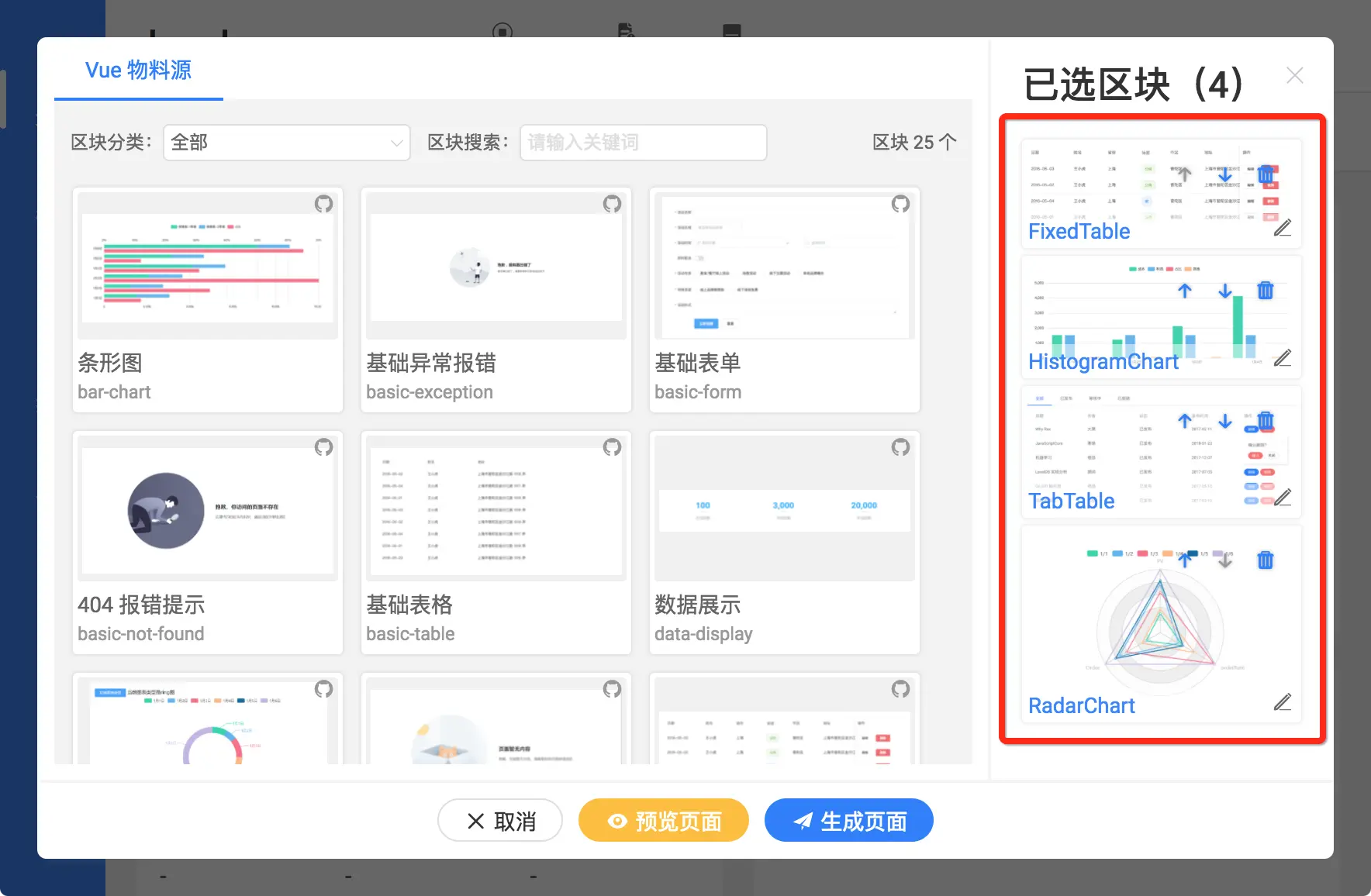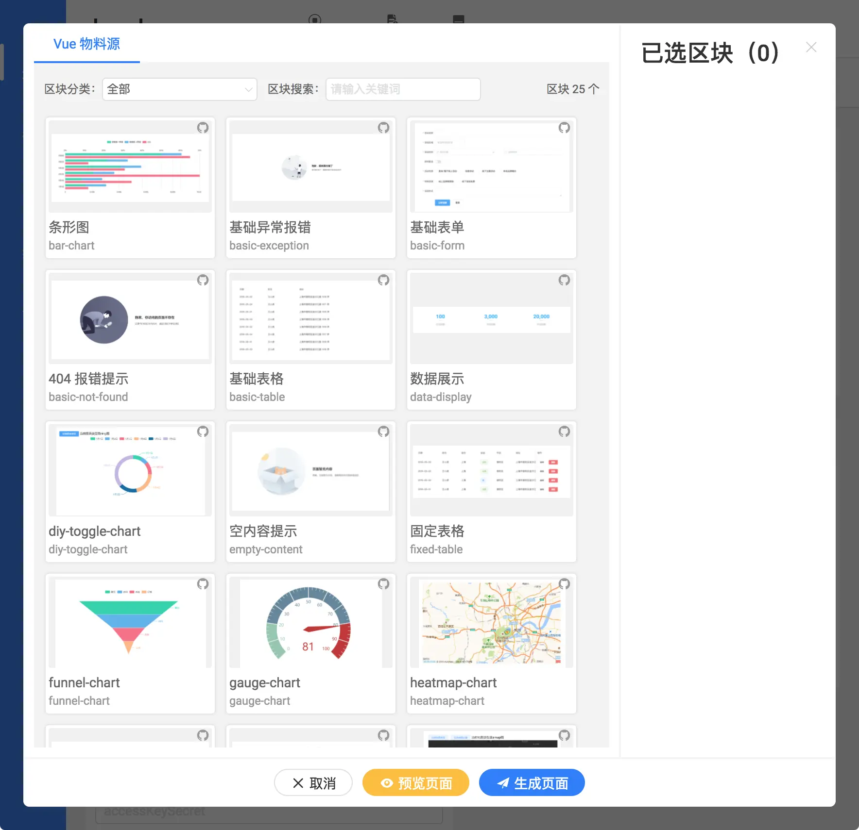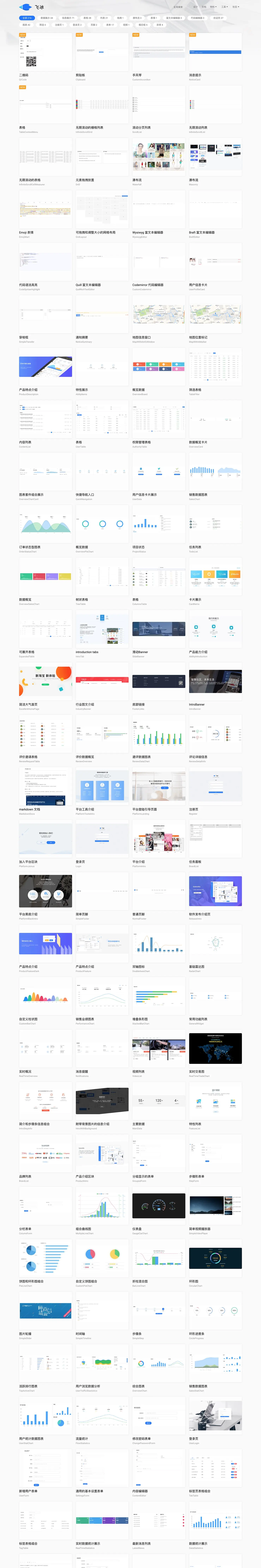 飞冰是从 react 开始做的,现在 vue 和 Angular 物料源还比较少,我们切换到 vue 选项卡里...